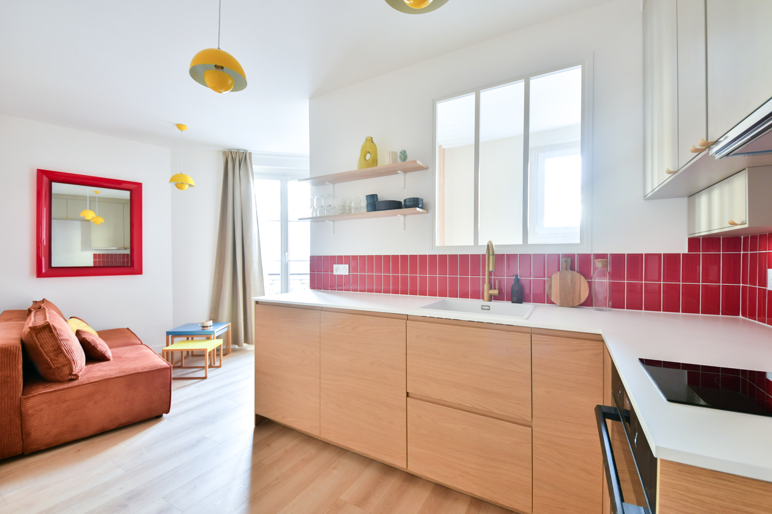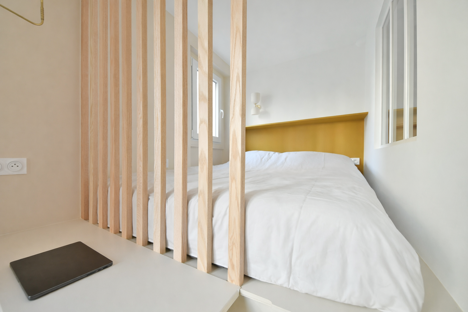 La dépose totale des cloisons et des équipements existants ont permis de concevoir un pied-à-terre chaleureux, fonctionnel et optimisé dans ses moindres usages.